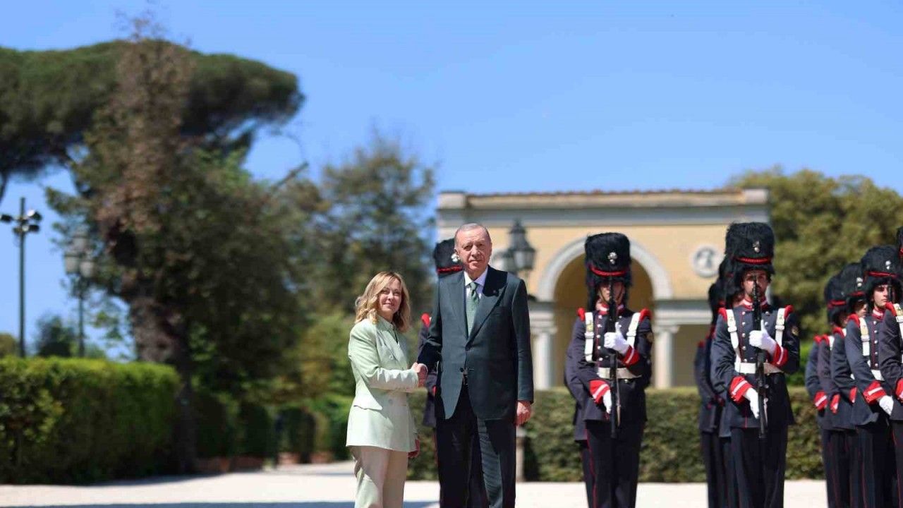 Cumhurbaşkanı Recep Tayyip Erdoğan, İtalya Başbakanı Giorgia Meloni davetine icabetle başkent Roma’ya geldi. Cumhurbaşkanı Erdoğan ve beraberindeki heyet, Roma Fiumicino Leonardo da Vinci Uluslararası Havalimanı’nda İtalya Protokol Müdürü Bruno Pasquino ile Türkiye’nin Roma Büyükelçisi Elif Çomoğlu Ülgen ve eşi Sinan Ülgen, Milano Başkonsolosu Mehmet Özöktem, Vatikan Büyükelçiliği Geçici Maslahatgüzarı Neslihan Altay ve Roma Büyükelçiliği personeli tarafından karşıladı. Cumhurbaşkanı Erdoğan havalimanının ardından Meloni’nin resmi görüşmelerini gerçekleştirdiği Villa Doria Pamphili’ya geçti. Cumhurbaşkanı Erdoğan, Villa Doria Pamphili’da İtalya Başbakanı Giorgia Meloni tarafından resmi törenle karşılandı. Cumhurbaşkanı Erdoğan, resmi karşılama töreninde karşılama kıtasını karşıladı.