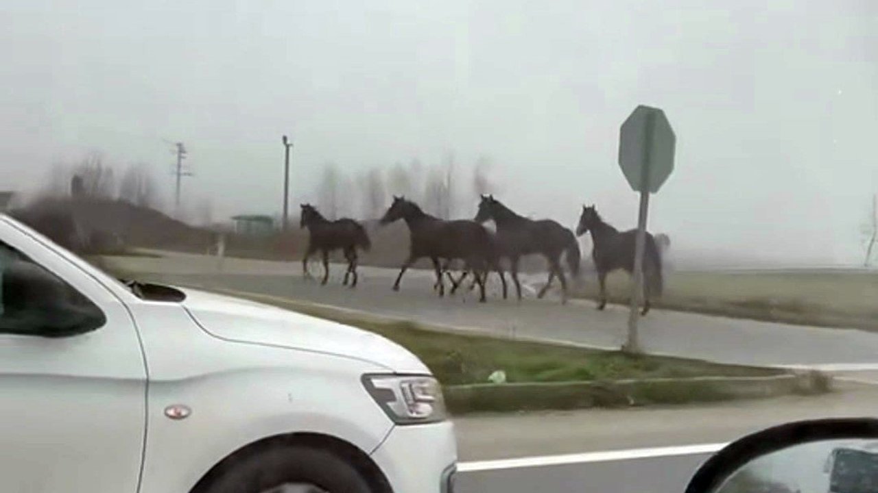 Sakarya’nın Akyazı ilçesi D-140 kara yoluna çıkan atlar dörtnala koştu. Görenleri hayrete düşüren anlar saniye saniye cep telefonu kamerasıyla kaydedildi.