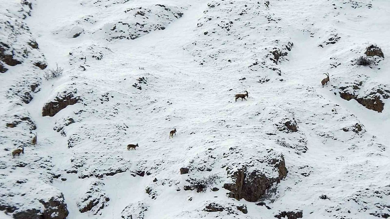 Erzincan ile Tunceli arasındaki platoda 130 kilometre uzunlukta batıdan doğuya uzanan Munzur Dağlarında çok sayıda dağ keçisi görüntülendi. 3 bin 300 rakımlı Munzur Dağlarının karlı zirvesinde ve zaman zaman da bin rakımlı aşağı kısımlara inen çengel boynuzlu (şamua) ve dağ keçileri sürüler halinde görüntülendi. Dağ keçileri, karlar üzerinde bir süre gezinip gözden kayboldu.