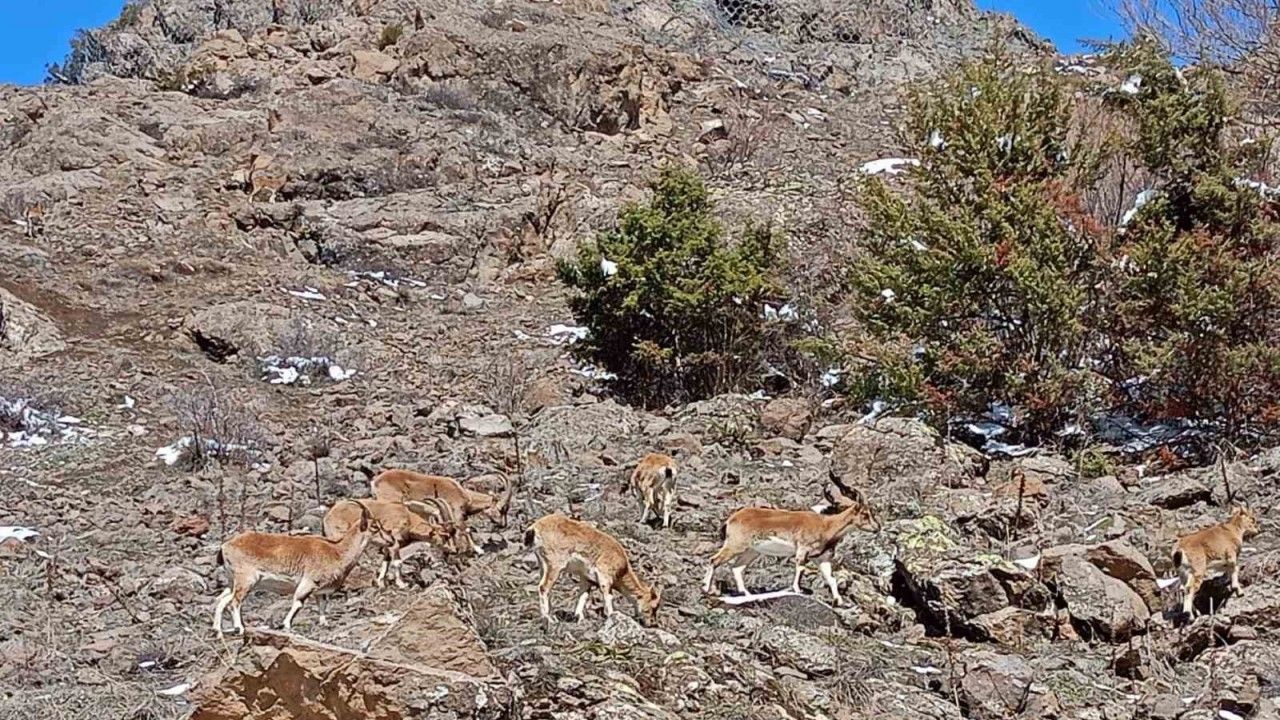 Doğanın uzman tırmanıcıları olarak bilinen dağların süsü dağ keçileri, Bayburt’un yüksek kesimli bir köyünün dağ eteklerinde görüldü. Sürü halinde gezen dağ keçiler, telefonu kamerasına yansıdı.