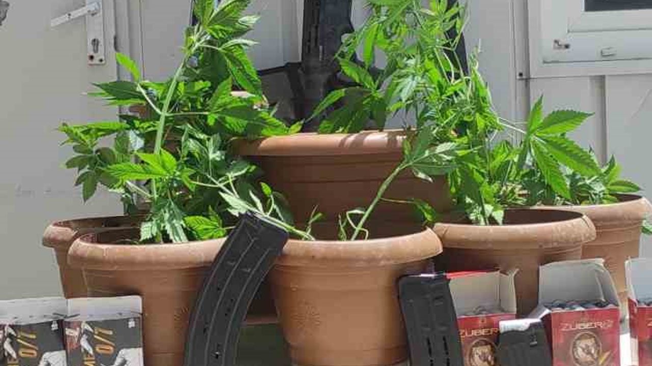 İkamette yapılan aramada ise saksılar içerisine dikilmiş halde 19 kök Hint keneviri bitkisi, 2 adet otomatik tüfek, 1 adet pompalı tüfek, 3 adet şarjör, 119 adet fişek ele geçirildi.
