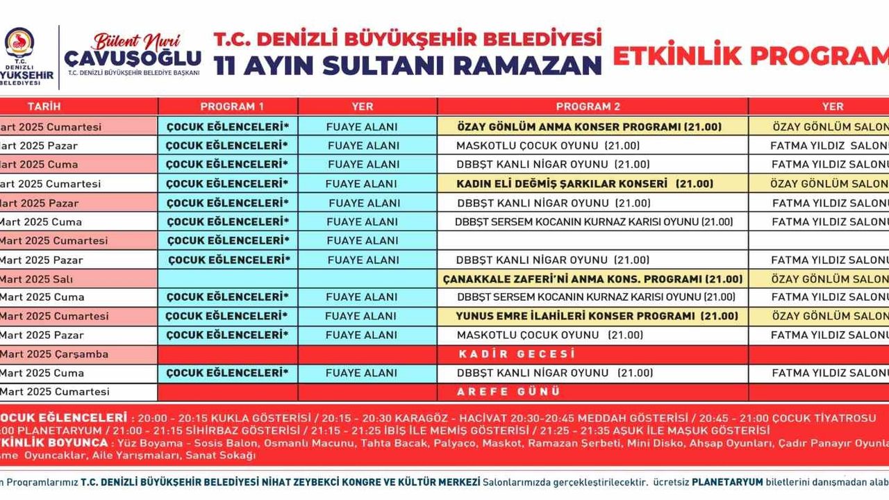 Denizli Büyükşehir Belediyesi, ramazan ayında sadece kent merkezinde değil tüm ilçelerde her yaş grubuna özel kültür, sanat dolu etkinlik takvimi hazırladı. Etkinlikler kent merkezinde Nihat Zeybekci Kongre ve Kültür Merkezi’nde, diğer 17 ilçede ise ilçe merkezlerinde gerçekleştirilecek. Çocuk şenliğinden, tiyatro gösterilerine, konserlerden meddah gösterilerine pek çok keyifli etkinlik ramazan ayı boyunca Denizlililerle olacak. Etkinlikler kapsamında ayrıca yüz boyama-sosis balon, tahta bacak, palyaço, maskot, mini disko, ahşap oyunları, çadır panayır oyunları, şişme oyuncaklar, aile yarışmaları, sanat sokağı yer alacak. Ayrıca etkinliklere gelen davetlilere osmanlı macunu ve ramazan şerbeti ikram edilecek.