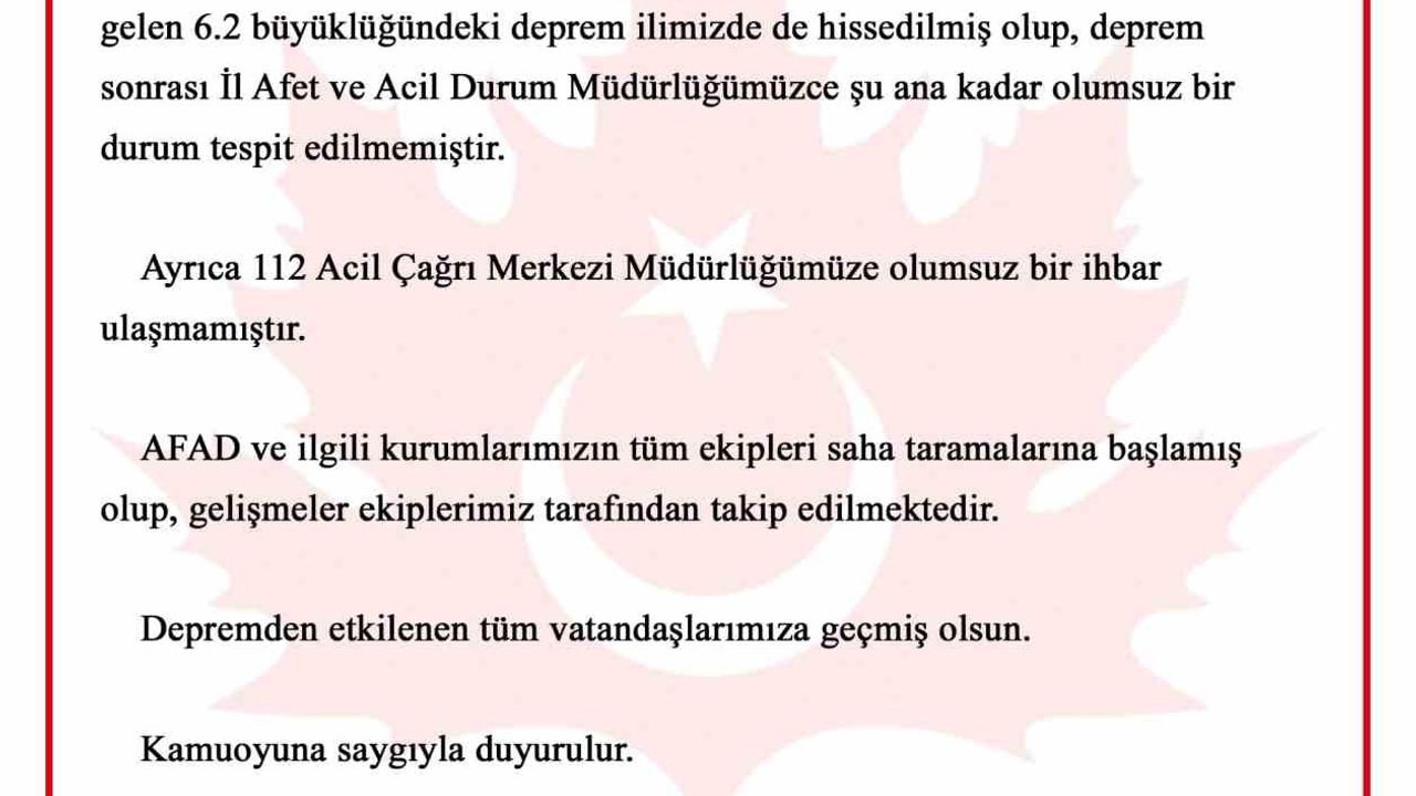 Bursa Valiliği’nden yapılan açıklamada, "Marmara Denizi’nde, İstanbul Silivri açıklarında, saat 12.49’da meydana gelen 6.2 büyüklüğündeki deprem ilimizde de hissedilmiş olup, deprem sonrası İl Afet ve Acil Durum Müdürlüğümüzce şu ana kadar olumsuz bir durum tespit edilmemiştir. Ayrıca 112 Acil Çağrı Merkezi Müdürlüğümüze olumsuz bir ihbar ulaşmamıştır. AFAD ve ilgili kurumlarımızın tüm ekipleri saha taramalarına başlamış olup, gelişmeler ekiplerimiz tarafından takip edilmektedir. Depremden etkilenen tüm vatandaşlarımıza geçmiş olsun. Kamuoyuna saygıyla duyurulur" denildi.
