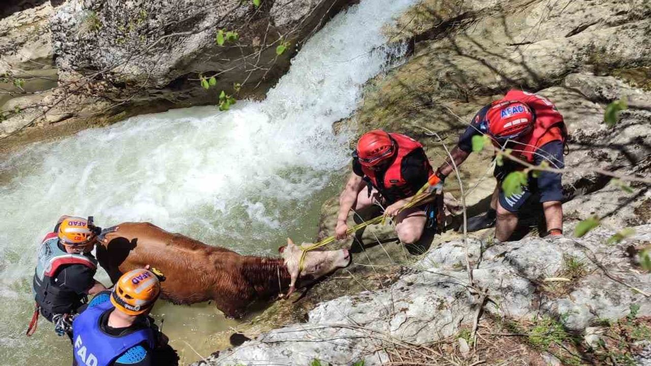 Edinilen bilgiye göre Selmanlı Mahallesi’nde kayalıklardan yuvarlanan dana dere yatağında mahsur kaldı. Köylülerin uğraşlarıyla bulunduğu yerden çıkartılamayan büyükbaş hayvan için 112 Acil Çağrı Merkezi’nden yardım istendi. İhbarla bölgeye giden İl Afet ve Acil Durum Müdürlüğü (AFAD) ekipleri, mahsur kalan hayvanı ip yardımıyla mahsur kaldığı alandan çıkarıp sahibine teslim etti.