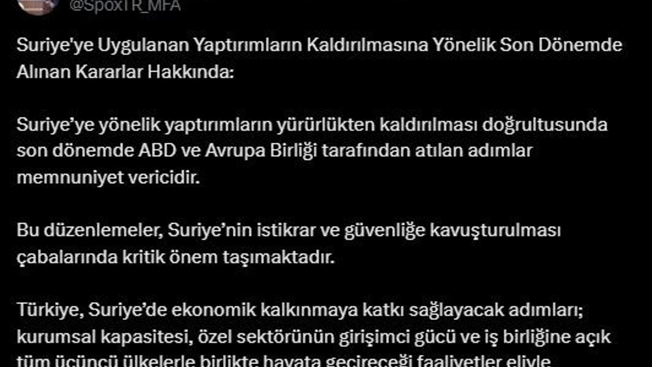 Dışişleri Bakanlığı Sözcüsü Öncü Keçeli, Suriye’ye uygulanan yaptırımların kaldırılması kararına ilişkin sosyal medya hesabından yaptığı paylaşımda ABD ve Avrupa Birliği tarafından atılan adımların memnuniyet verici olduğunu belirtti. Keçeli paylaşımında, "Bu düzenlemeler, Suriye’nin istikrar ve güvenliğe kavuşturulması çabalarında kritik önem taşımaktadır. Türkiye, Suriye’de ekonomik kalkınmaya katkı sağlayacak adımları; kurumsal kapasitesi, özel sektörünün girişimci gücü ve iş birliğine açık tüm üçüncü ülkelerle birlikte hayata geçireceği faaliyetler eliyle desteklemeye devam edecektir" ifadelerine yer verdi.