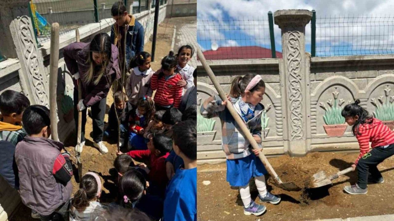 Ağrı’nın Diyadin ilçesinde bulunan Mehmet Melik Özmen İlkokulu öğrencileri, öğretmenleriyle birlikte okul çevresine ağaç dikti