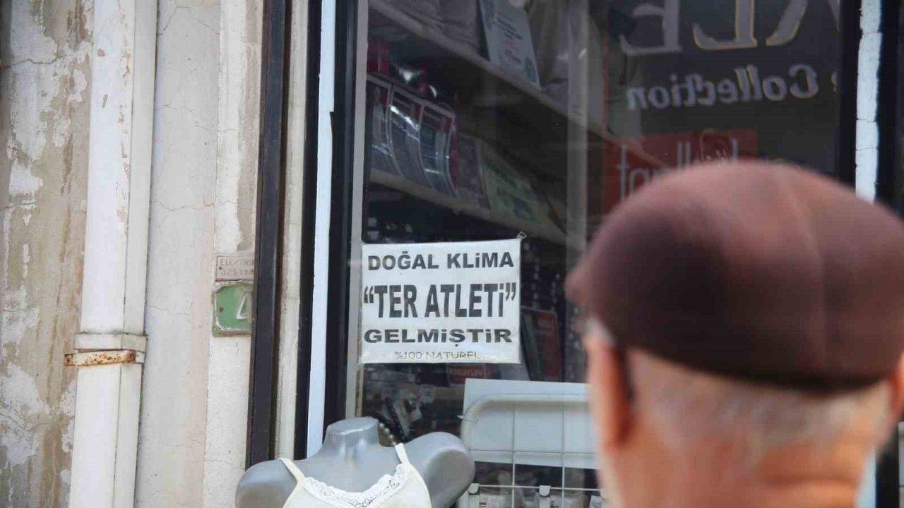 Meteoroloji Genel Müdürlüğü verilerine göre, yurt genelinde hava sıcaklıklarının hafta içinde yükseleceğini duyurması üzerine sıcaktan bunalmak istemeyen vatandaşlar çözüm yolu arıyor. Bursa’da yıllardır yün iç çamaşırı satışı yapan esnaf Naci Bağcı ise baharın gelmesini fırsat bilerek dükkanının camına bir afiş astı. Daha öncesinde ’Doğalgazı düşüren donlar burada’ afişi ile görenleri şaşırtan Bağcı, bu sefer de ’Doğal klima ter atleti gelmiştir’ yazarak görenleri gülümsetti.