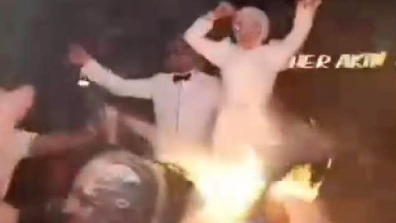 Mersin’in Silifke ilçesinde gerçekleştirilen düğün merasiminde yaşanan olay, konuklardan birinin cep telefonu kamerasına yansıdı. Sosyal medyada da paylaşılan görüntülerde, düğün merasimi sırasında düzenlenen eğlencede gelin ve damat pistte oynadığı sırada köpüklü ve meşaleli şov gerçekleştirildiği anlar yer aldı. Eğlence sırasında kafasına köpük sıkılan bir kişinin saçlarının, elde gezdirilen meşaleden sıçrayan kıvılcımlar nedeniyle alev aldığı anlar da görüntülere yansıdı. Kısa süreli paniğin yaşandığı olayda, saçları alev alan kişi alevleri eliyle söndürerek yanmaktan kurtuldu.