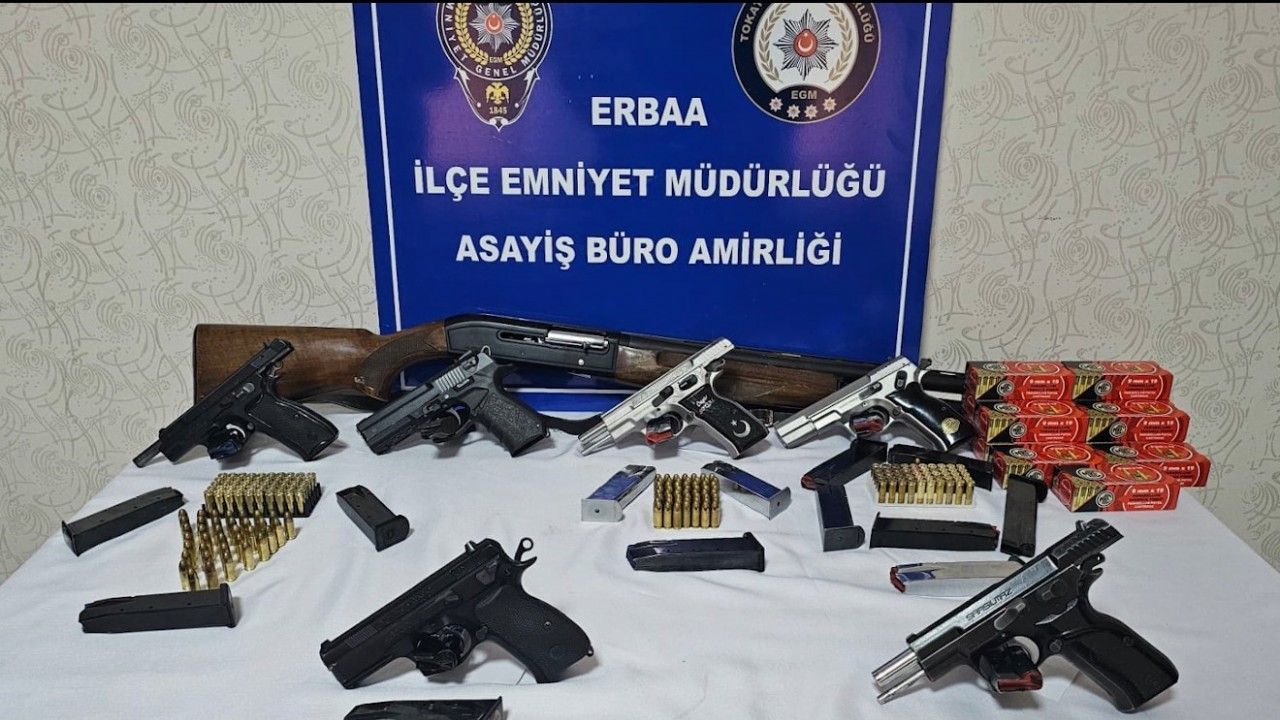 Erbaa ilçesinde düğünlerde silahla havaya ateş açılmasına yönelik yapılan çalışmalar kapsamında, İlçe Emniyet Müdürlüğü ile Kaçakçılık ve Organize Suçlarla Mücadele Şube Müdürlüğü’nün ortaklaşa yürüttüğü operasyonda 7 şüpheli tespit edildi. Şüphelilerin ikamet ve iş yerlerinde yapılan aramalarda 5 adet tabanca, 1 adet av tüfeği, 1 adet kurusıkı tabanca, 19 adet şarjör ve 849 adet fişek ele geçirildi. Şüpheliler hakkında gerekli adli ve idari işlemler başlatıldı.
