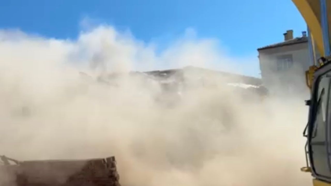 Kahramanmaraş’ta 6 Şubat 2023’te meydana gelen yıkıcı depremlerden etkilenen Elazığ’da ağır hasarlı binaların yıkımı devam ediyor. Bu çerçevede Sürsürü Mahallesinde bulunan 4 kat 8 daireli bir bina iş makinesi ile yıkıldı. Binanın yıkım anı cep telefonu ile görüntülendi.