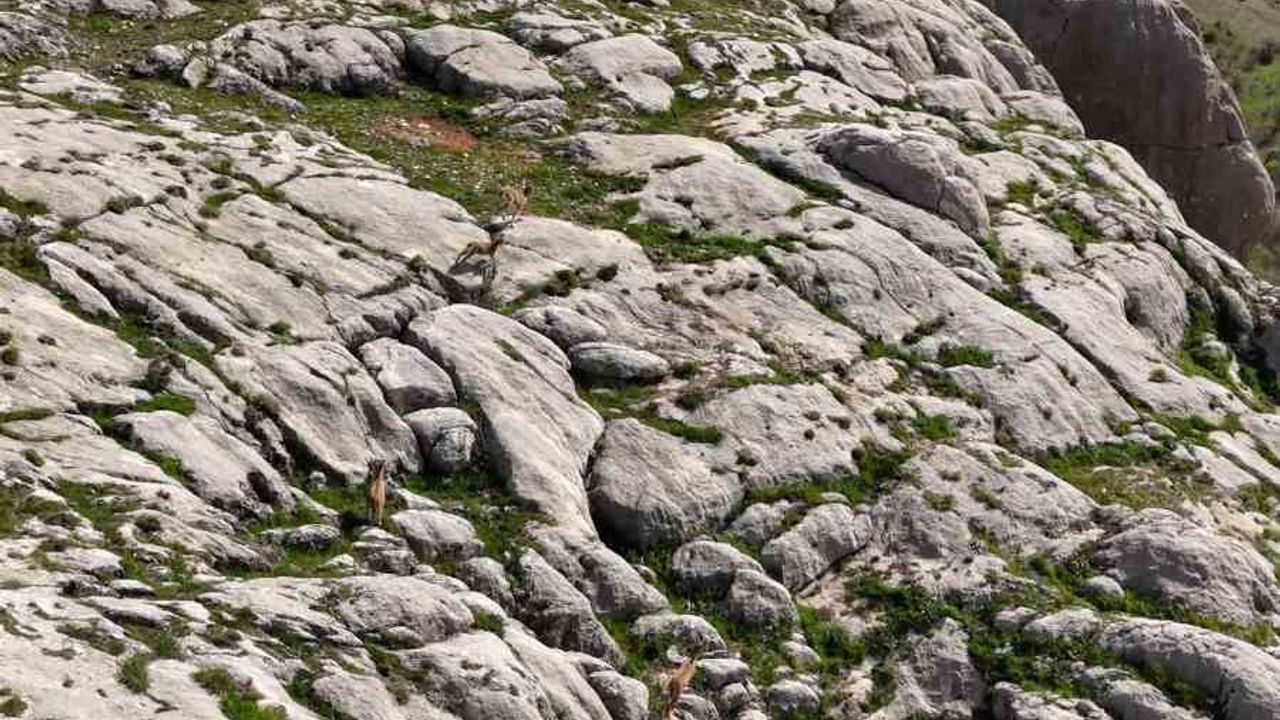 Elazığ’da koruma altındaki dağ keçileri, dron ile görüntülendi.