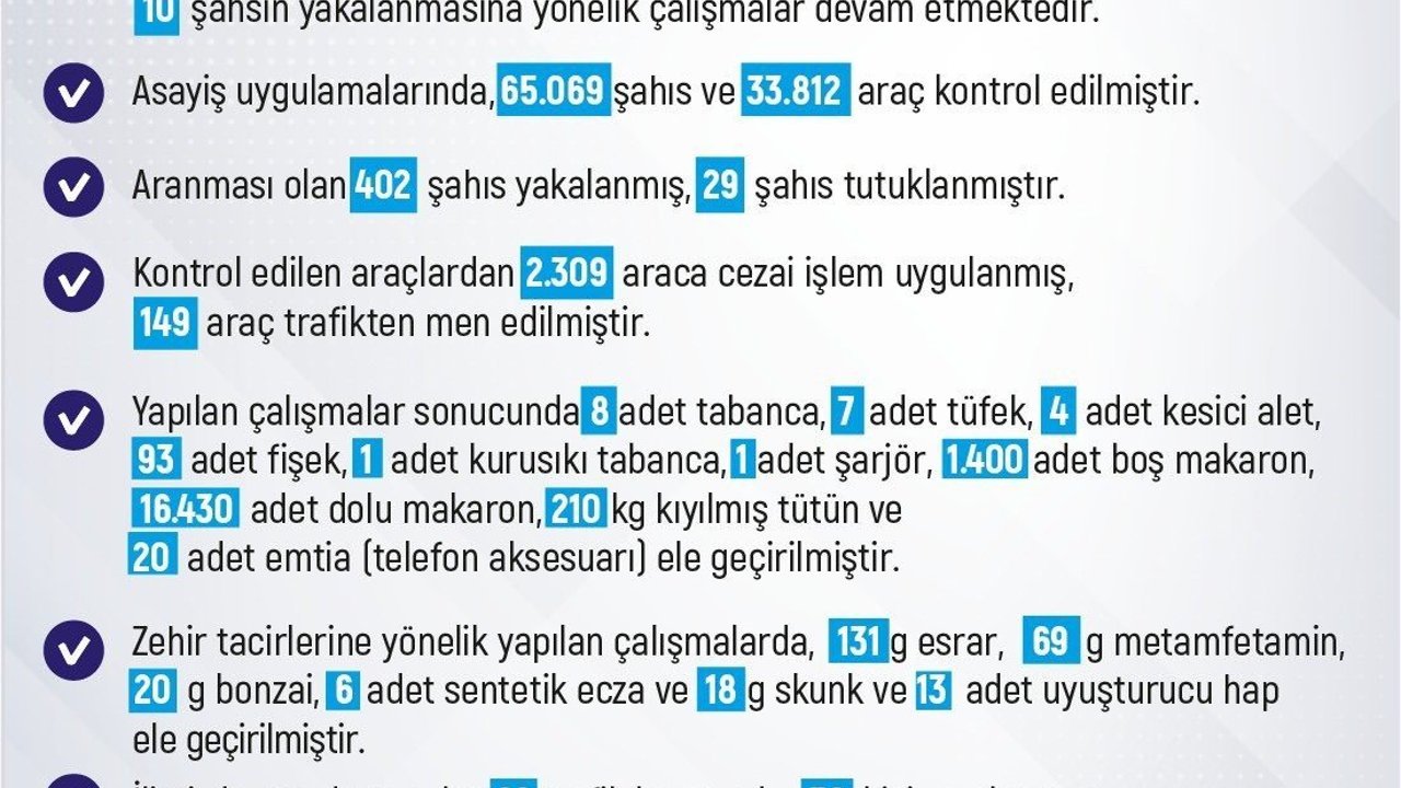 Yapılan çalışmalar sonucunda 8 adet tabanca, 7 adet tüfek, 4 adet kesici alet, 93 adet fişek, 1 adet kurusıkı tabanca, 1 adet şarjör, bin 400 adet boş makaron, 16 bin 430 adet dolu makaron, 210 kilo kıyılmış tütün ve 20 adet telefon aksesuarı ele geçirildi. Zehir tacirlerine yönelik yapılan çalışmalarda, 131 gram esrar, 69 gram metamfetamin, 20 gram bonzai, 6 adet sentetik ecza ve 18 gram skunk ve 13 adet uyuşturucu hap ele geçirildiği bildirildi.