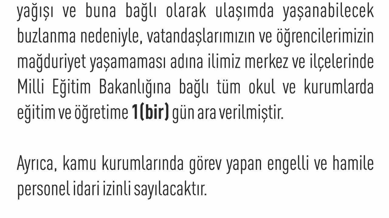 Elazığ Valiliği’nde yapılan açıklamada, "6 Şubat 2025 Perşembe günü ilimizde beklenen yoğun kar yağışı ve buna bağlı olarak ulaşımda yaşanabilecek buzlanma nedeniyle, vatandaşlarımızın ve öğrencilerimizin mağduriyet yaşamaması adına ilimiz merkez ve ilçelerinde Milli Eğitim Bakanlığına bağlı tüm okul ve kurumlarda eğitim ve öğretime 1 (bir) gün ara verilmiştir. Ayrıca, kamu kurumlarında görev yapan engelli ve hamile personel idari izinli sayılacaktır" denildi.