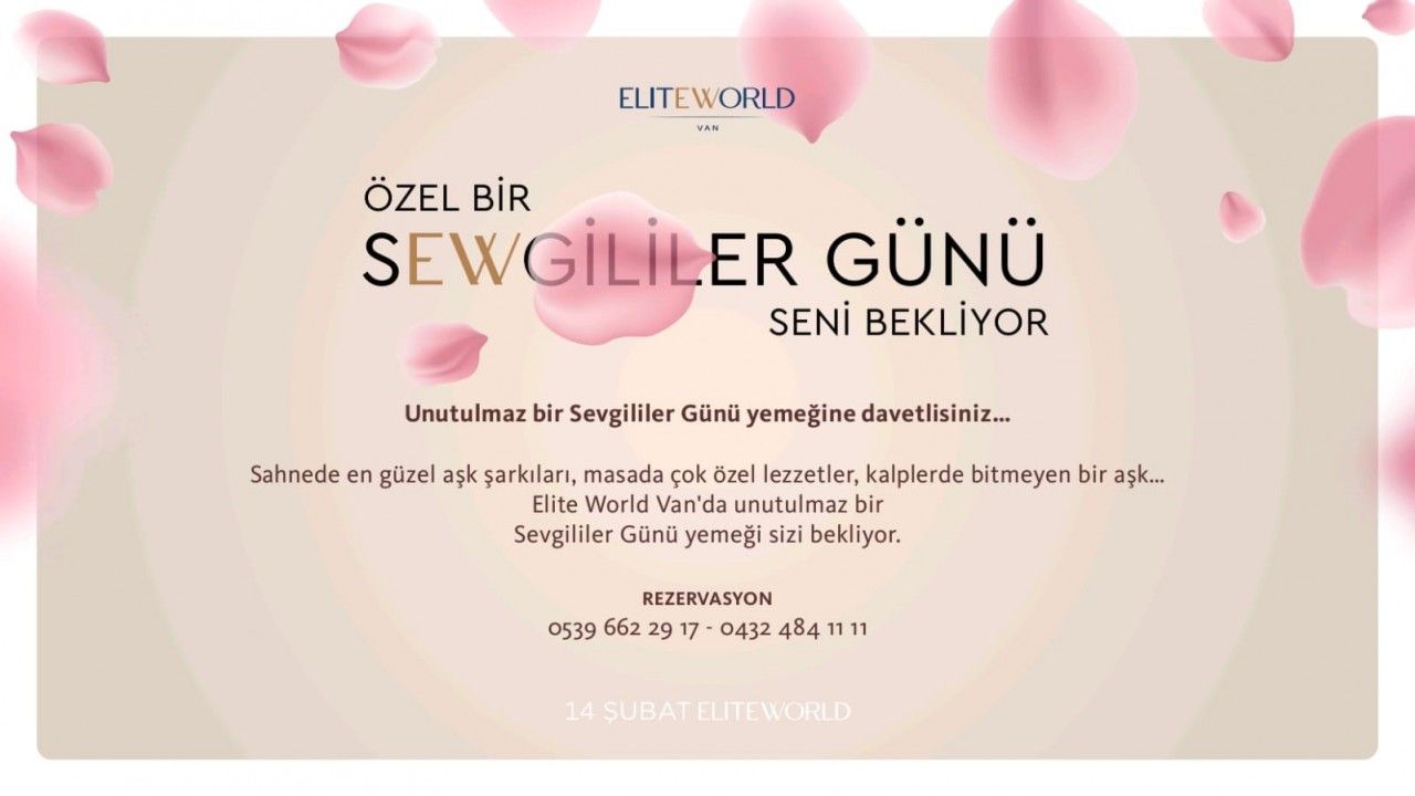Kazım Karabekir Caddesi üzerinde yer alan ve sunduğu beş yıldız hizmet kalitesi ile özel günlerin de vazgeçilmez adresi olan Elite World Van Otel, Sevgililer Günü hazırlıklarını tamamladı. Geceyle ilgili açıklamada bulunan Elite World Van Otel Genel Müdürü Oktay Aksoy, "Sevgililere güzel bir gece yaşatmak amacıyla Elite World Van Oteli olarak hazırlıklarımızı tamamladık. Sevgililer Günü’nde zamanı aşkla durdurun, lezzetle buluşun. Canlı müzik eşliğinde unutulmaz bir Sevgililer Günü menüsü, Elite World Van’da sizi ve aşkınızı bekliyor" dedi.