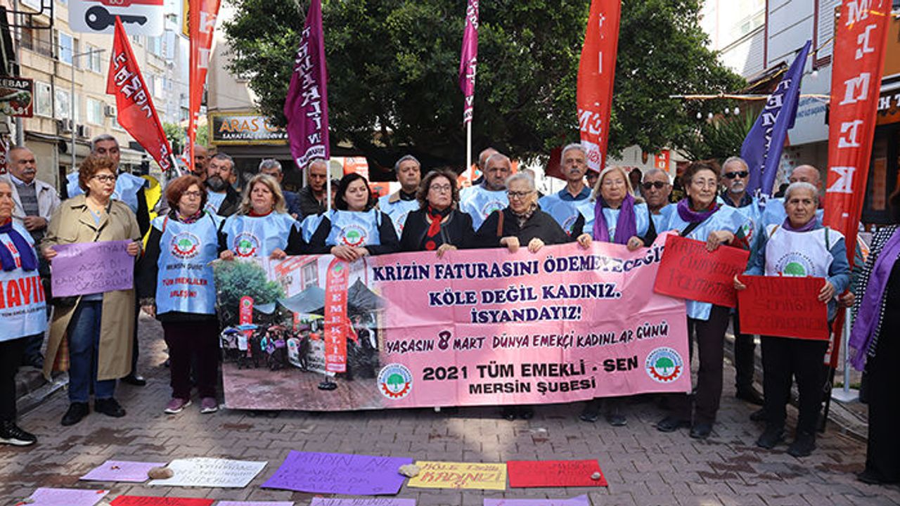 2021 Tüm Emekliler Sendikası (Tüm Emekli Sen) Mersin Şubesi üyeleri, sendika binalarının önünde toplanarak 8 Mart Dünya Emekçi Kadınlar Günü’ne ilişkin basın açıklaması gerçekleştirdi. 2021 Tüm Emekli Sen Kadın Sekreterliği’nin öncülüğünde yapılan açıklamada, “Krizin faturasını ödemeyeceğiz. Köle değil kadınız. İsyandayız” yazılı pankart açıldı. Ayrıca kadınlar, öldürülen kadınların isimlerinin yer aldığı dövizleri yere sererek üzerlerine mum diktiler. Açıklamayı 2021 Tüm Emekli Sen Mersin Şube Kadın Sekreteri Sıdıka Gündüz okudu.