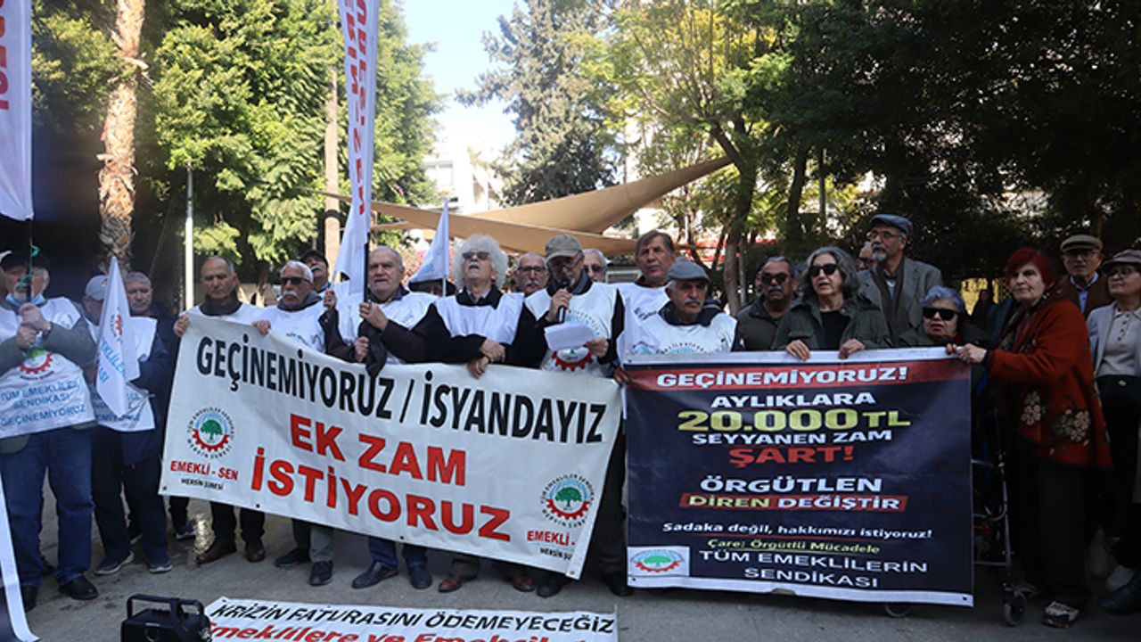 2017 Tüm Emeklilerin Sendikası (Tüm Emekli Sen) Mersin Şubesi üyeleri, Akdeniz ilçesinde yer alan Yoğurt Pazarı’nda toplanarak emekli ücretlerine seyyanen zam yapılması için ses çıkardı. “Geçinemiyoruz, isyandayız. Ek zam istiyoruz” yazılı pankartın açıldığı açıklamayı 2017 Tüm Emekli Sen Mersin Şube Başkanı Ahmet Karakuş okudu.