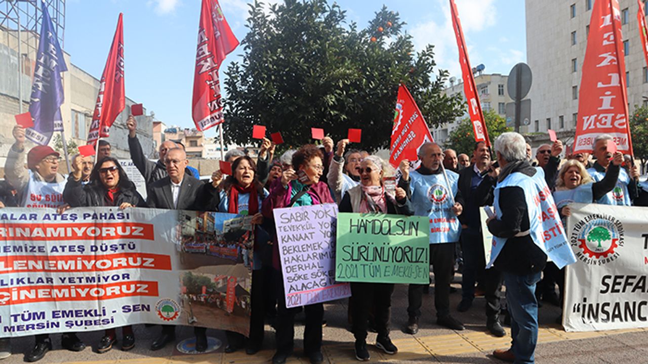 2021 Tüm Emeklilerin Sendikası (Tüm Emekli Sen) Mersin Şubesi üyeleri, hakları için sokakta ses yükseltmeye devam ediyor. Sendika binalarından Mersin Defterdarlığı’na kadar yürüyen ve defterdarlık önünde basın açıklaması yapan emekliler, emekli maaşına ek 20 bin TL seyyanen zam taleplerini yenilediler. CHP Mersin İl Başkanı Koral Ömür, DİSK Genel İş Mersin Şube Başkanı Kemal Göksoy, eski Mersin Barosu Başkanı Avukat Bilgin Yeşilboğaz, siyasi parti ve sendika temsilcileri de açıklamaya destek verdi. Emekliler adına açıklamayı Tüm Emekli Sen Mersin Şube Başkanı Hüseyin Kurt okudu.