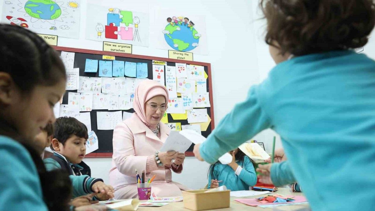 Daha sonra okul öncesi eğitim alan çocukların bulunduğu sınıfa geçen Emine Erdoğan, çocuklarla oyun oynadı, yaptıkları resimler hakkında sohbet etti.