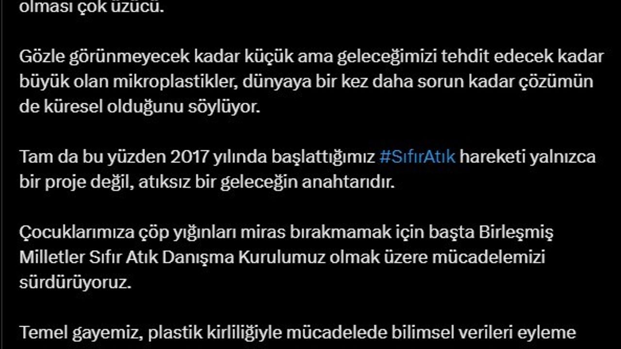 Cumhurbaşkanı Recep Tayyip Erdoğan’ın eşi Emine Erdoğan, Türk bilim insanlarının Antarktika’da mikroplastik tespit etmesine ilişkin, "Gözle görünmeyecek kadar küçük ama geleceğimizi tehdit edecek kadar büyük olan mikroplastikler, dünyaya bir kez daha sorun kadar çözümün de küresel olduğunu söylüyor. Bu yüzden 2017 yılında başlattığımız Sıfır Atık hareketi yalnızca bir proje değil, atıksız bir geleceğin anahtarıdır" dedi.