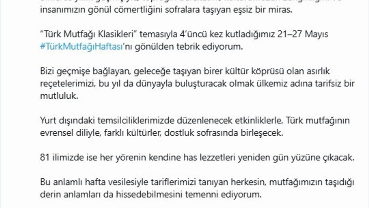 "’Türk mutfağı klasikleri’ temasıyla 4’üncü kez kutladığımız 21-27 Mayıs Türk Mutfağı Haftası’nı gönülden tebrik ediyorum. Bizi geçmişe bağlayan, geleceğe taşıyan birer kültür köprüsü olan asırlık reçetelerimizi, bu yıl da dünyayla buluşturacak olmak ülkemiz adına tarifsiz bir mutluluk. Yurt dışındaki temsilciliklerimizde düzenlenecek etkinliklerle Türk mutfağının evrensel diliyle farklı kültürler dostluk sofrasında birleşecek. 81 ilimizde ise her yörenin kendine has lezzetleri yeniden gün yüzüne çıkacak. Bu anlamlı hafta vesilesiyle tariflerimizi tanıyan herkesin mutfağımızın taşıdığı derin anlamları da hissedebilmesini temenni ediyorum. Ve elbette, gelenekten geleceğe uzanan bu kıymetli emanetin sağlıkla, sürdürülebilirlikle ve sevgiyle yaşatılmasını diliyorum. Sofralarımızdan bereket, kültürümüzden birlik eksik olmasın."