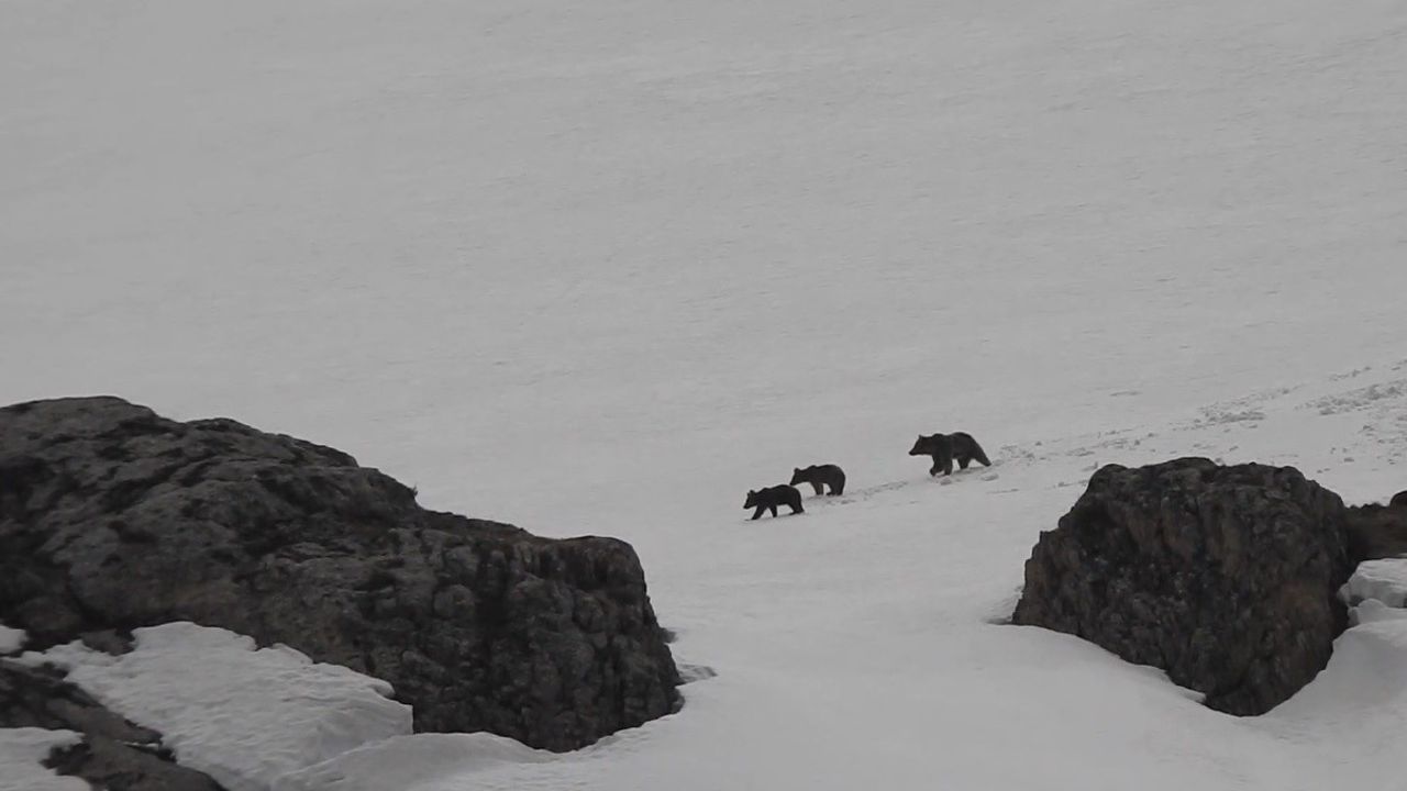 Erzincan’da bulunan Munzur Dağlarında kış uykusuna yatmayan anne ayı ve iki yavrusu doğada yiyecek ararken görüntülendi.