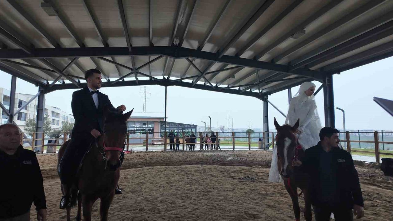 Damat Behçet Demir, 'İlk defa evleniyorum. Benim normal evlenmem uygun olmazdı. Atın üzerinde evlenmem şarttı. Eşim de çok iyi at biner. O yüzden böyle bir şey uygun gördük. Sağ olsun eşim de bunu uygun gördü. Aslında nikah şahidini de at yapacaktık ama bunu kabul etmediler maalesef. O yüzden nikah şahidimiz insanlar oldu. Atlarla beraber güzel bir nikah kıyacağız' dedi.