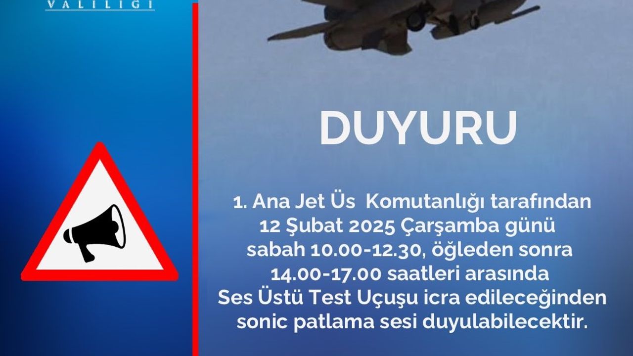 Eskişehir Valiliği, duyuruyu resmi sosyal medya hesapları üzerinden yayımlandı. Açıklamada, 12 Şubat 2025 tarihinde 1. Ana Jet Üs Komutanlığı tarafından 10.00-17.00 saatleri arasında ses üstü test uçuşu gerçekleştirileceği belirtildi. Ayrıca, sonic patlama sesi duyulabileceği konusunda uyarı yapıldı.