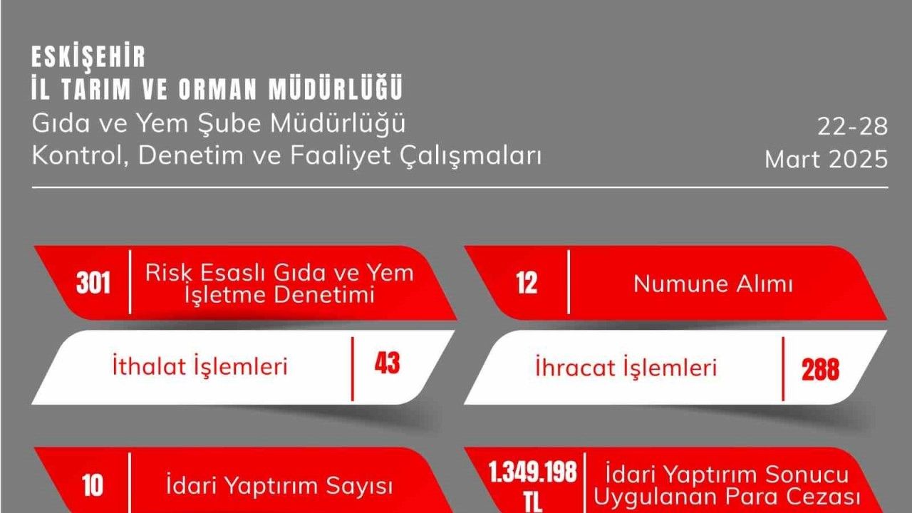 Eskişehir İl Tarım ve Orman Müdürlüğü’nün haftalık faaliyet raporuna göre, Gıda ve Yem Şube Müdürlüğü ekipleri, 22-28 Mart 2025 tarihleri arasında 301 risk esaslı gıda ve yem işletmesini denetledi. Denetimlerde 43 ithalat işlemi ve 288 ihracat işlemi gerçekleştirilirken, 12 numune alındı. Ayrıca, 10 idari yaptırım kararı uygulanarak toplamda 1 milyon 349 bin 198 TL para cezası kesildi, 2 işletme hakkında ise imha kararı alındı.