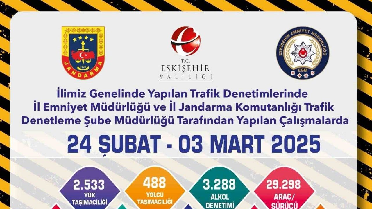 Eskişehir’de İl Emniyet Müdürlüğü ve İl Jandarma Komutanlığı Trafik Denetleme Şube Müdürlüğü tarafından yapılan belirli tarihler arasında yapılan trafik denetimlerinde 29 bin 298 araç ve sürücüsü kontrol edildi. Kontrollerde 9 bin163 araca işlem yapılırken, 278 araç trafikten men edildi. Ekiplerce kusurlu bulunan 121 sürücünün ehliyetine ise el konuldu.