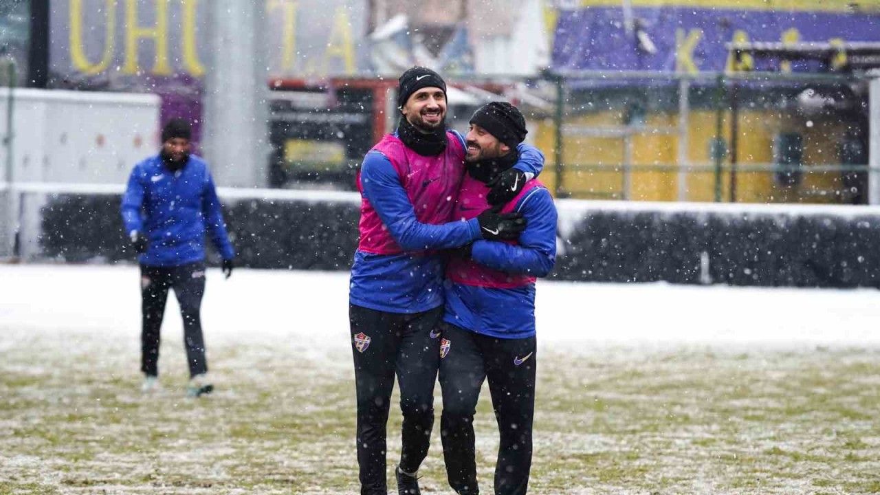 Teknik Direktör Arda Turan yönetiminde Eyüp Stadı’nda gerçekleştirilen antrenman, yoğun kar yağışı altında yapıldı. Isınma hareketleriyle başlayan idman, 5’e 2 top kapma çalışmasıyla devam etti. Eflatun-sarılı ekip, antrenmanı dar alanda oynanan çift kale maçla tamamladı.