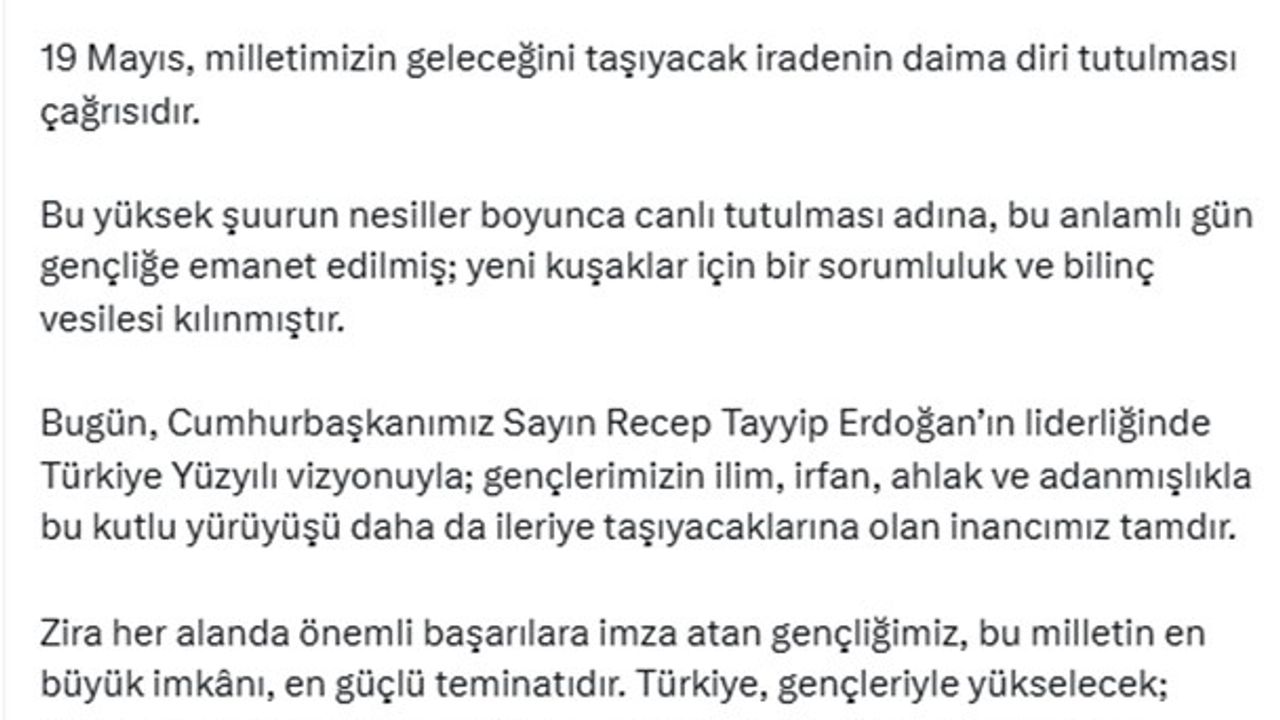 Altun mesajında Fahrettin Altun, 19 Mayıs’ın sadece bir tarih değil, aynı zamanda milletin bağımsızlık tutkusunun ve vatan sevgisinin düşman işgaline karşı direnişe dönüştüğü kutlu bir başlangıç olduğunu vurguladı. Altun, "19 Mayıs, milletimizin geleceğini taşıyacak iradenin daima diri tutulması çağrısıdır. Bu yüksek şuurun nesiller boyunca canlı tutulması adına, bu anlamlı gün gençliğe emanet edilmiş; yeni kuşaklar için bir sorumluluk ve bilinç vesilesi kılınmıştır" dedi.