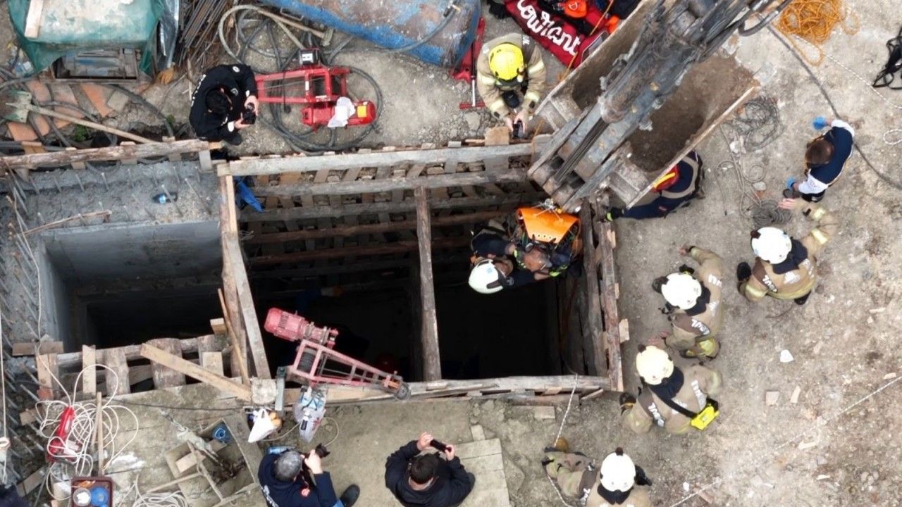 Öte yandan, itfaiye ekibinin yaralı işçiyi kurtarma çalışması havadan görüntülendi.