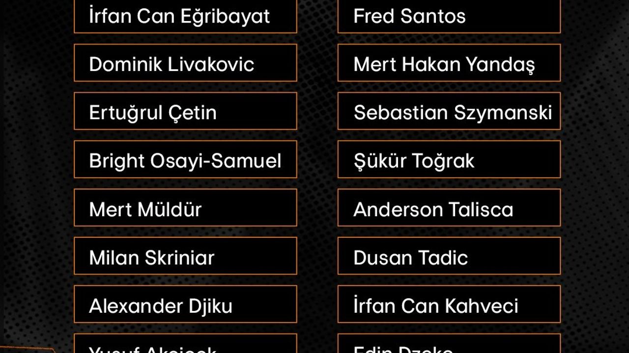 "İrfan Can Eğribayat, Dominik Livakovic, Osman Ertuğrul Çetin, Bright Osayi-Samuel, Mert Müldür, Milan Skriniar, Alexander Djiku, Yusuf Akçiçek, Filip Kostic, Sofyan Amrabat, İsmail Yüksel, Fred, Mert Hakan Yandaş, Sebastian Szymanski, Şükür Toğrak, Anderson Talisca, Dusan Tadic, İrfan Can Kahveci, Edin Dzeko, Youssef En-Nesyri, Cenk Tosun."