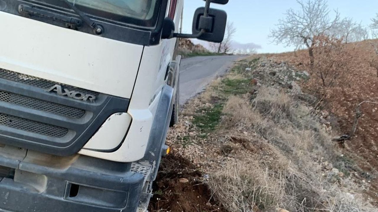 Adıyaman’da, freni boşalan beton mikseri şarampole devrileceği sırada imdat kolu sayesinde son anda durdu.