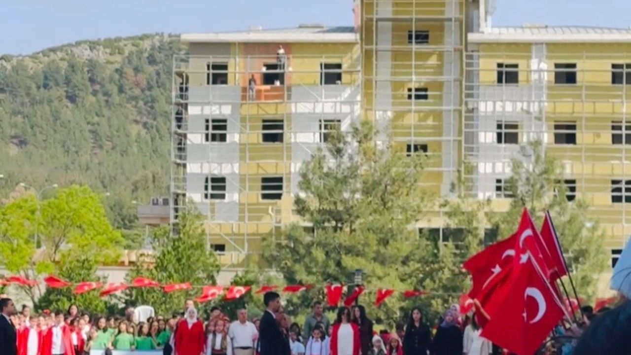 GAZİANTEP (İHA) – Gaziantep’te 23 Nisan programında İstiklal Marşı okunduğu esnada yan tarafta bulunan inşaatta çalışan 6 işçinin işi bırakarak saygı duruşuna geçtiği anlar izleyenleri duygulandırdı.