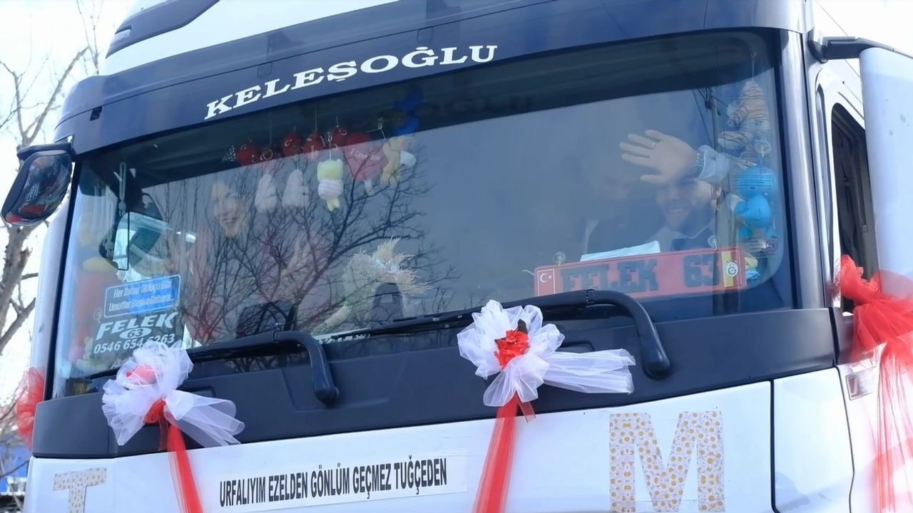 Tuğçe Durak da gelin arabası olan tırı gördüğünde heyecanlandığını ifade ederek, 'Bu anımızı ölümsüzleştirmek çok güzel oldu. Böyle bir organizasyon olması sürpriz oldu' diye konuştu.