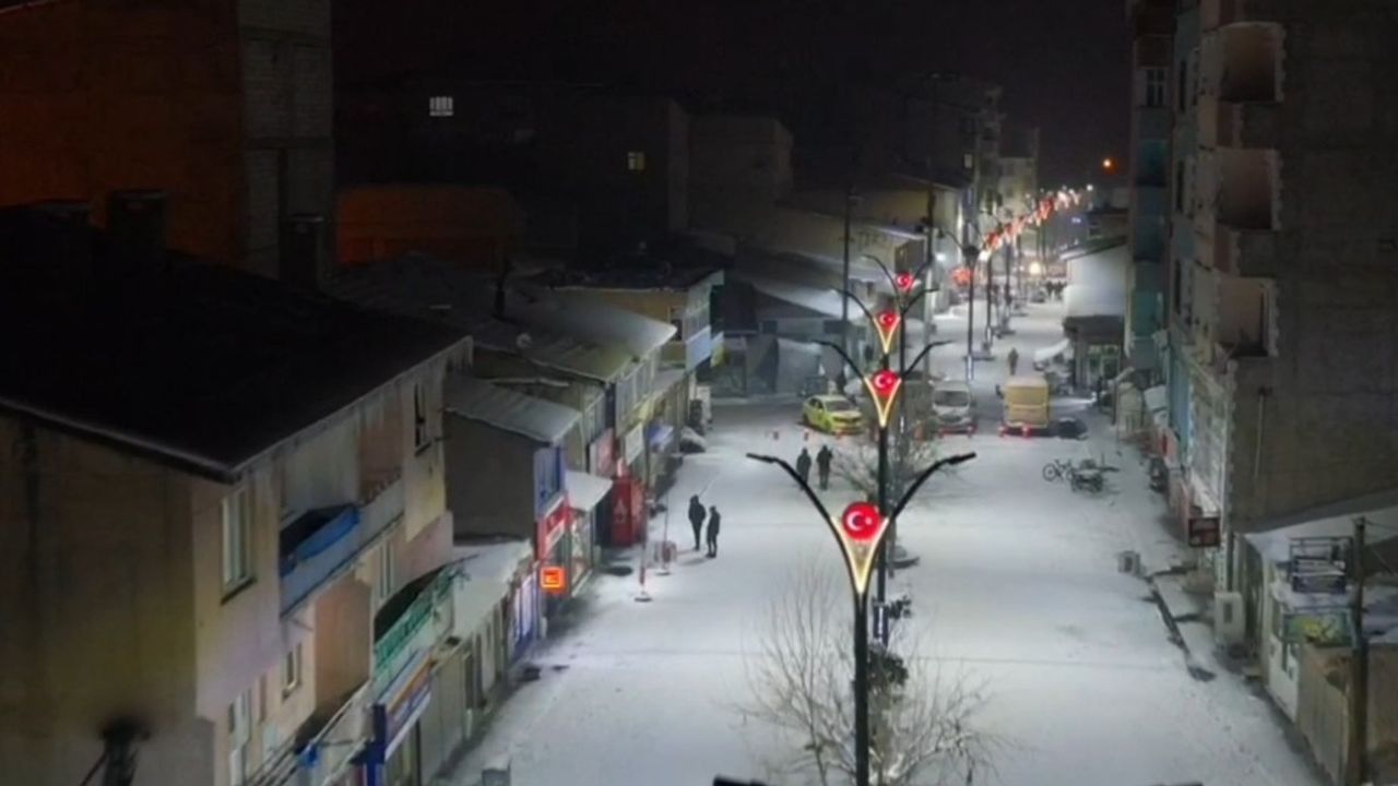 Ağrı’nın Diyadin ilçesinde akşam saatlerinde başlayan kar yağışı sonucu güne karla başlayan ilçe merkezi havadan görüntülendi.
