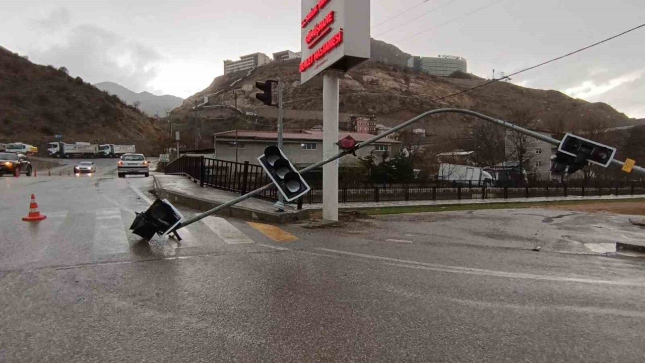 Gümüşhane’de etkili olan şiddetli fırtınada trafik ışıkları yola devrildi.