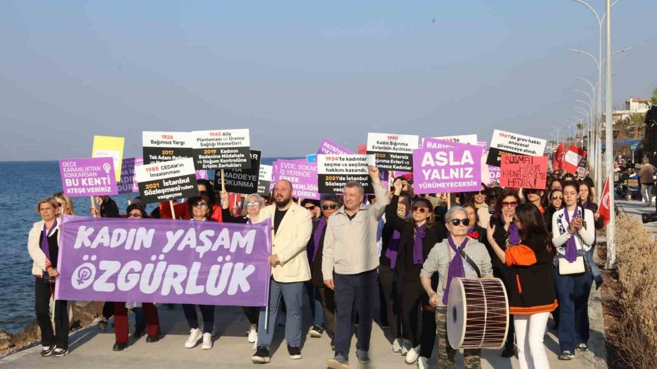 İzmir’de Güzelbahçe Belediyesinin düzenlediği 8 Mart Dünya Emekçi Kadınlar Günü programında ‘tersine yürüyüş’ yapan kadınlar, kadın haklarında geriye gidiş olduğunu dile getirerek bir protesto yürüyüşü düzenledi.