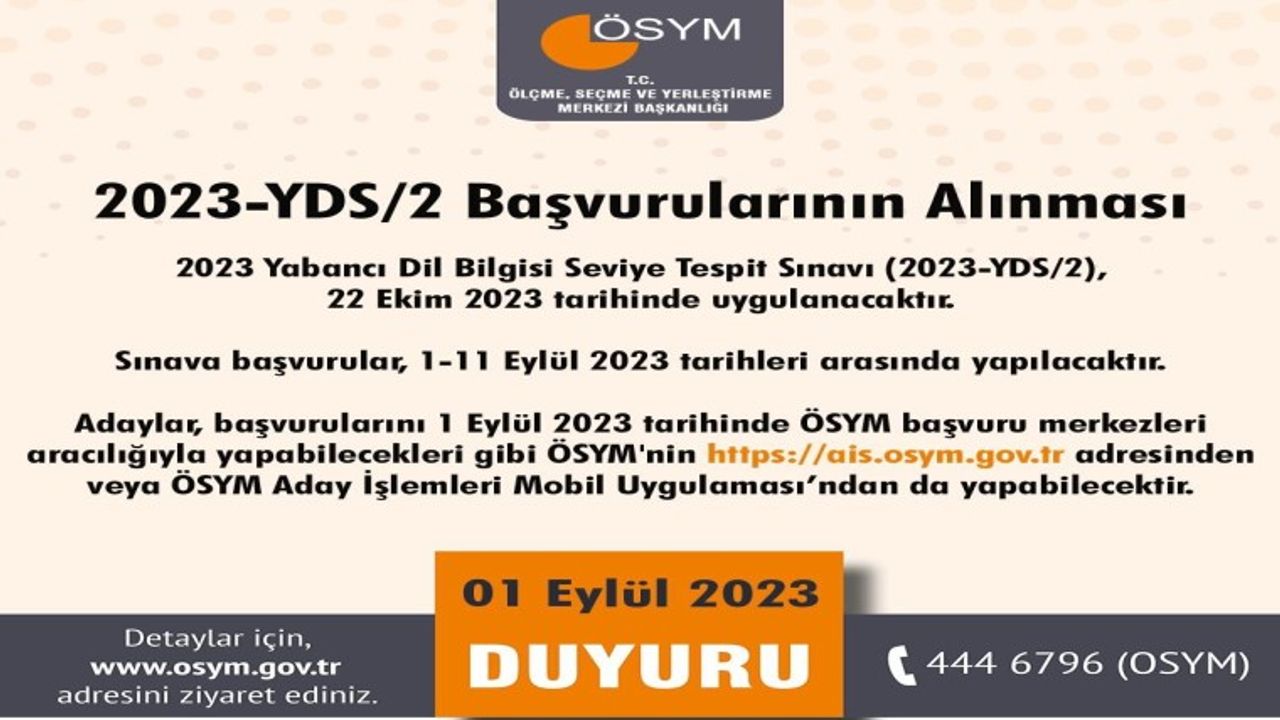 Ölçme, Seçme ve Yerleştirme Merkezi Başkanlığı (ÖSYM) tarafından yapılan açıklamada, 2023-YDS/2 başvurularının alınmaya başlandığı duyuruldu. Başvurular, 1-11 Eylül tarihleri arasında yapılabilecekken, 2023-YDS/2 22 Ekim tarihinde gerçekleştirilecek.