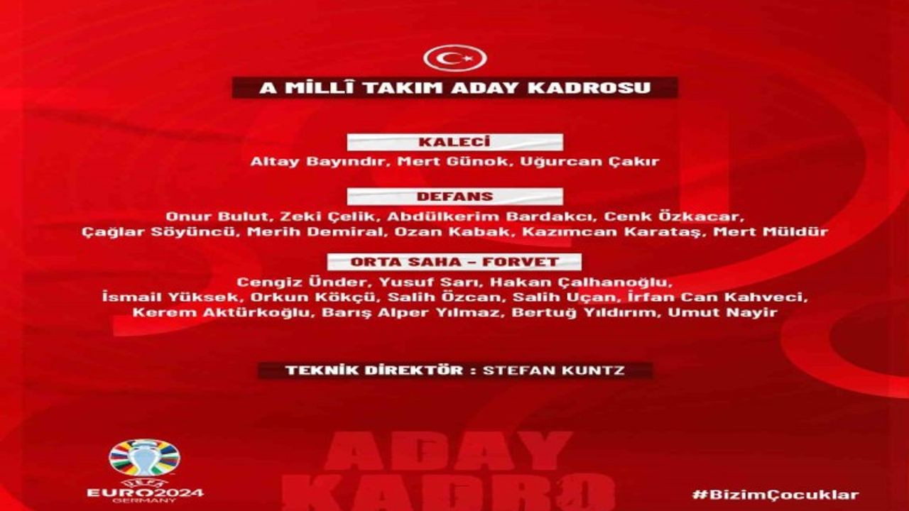 UEFA 2024 Avrupa Futbol Şampiyonası Elemeleri’nde 8 Eylül’de Ermenistan ve 12 Eylül’de özel maçta Japonya ile karşılaşacak A Milli Futbol Takımı’nın aday kadrosu belli oldu. Kazımcan Karataş, Yusuf Sarı ve Bertuğ Yıldırım, A Milli Futbol Takımı Teknik Direktörü Stefan Kuntz’un görev vermesi halinde ilk kez ay-yıldızlı formayı giyecek.