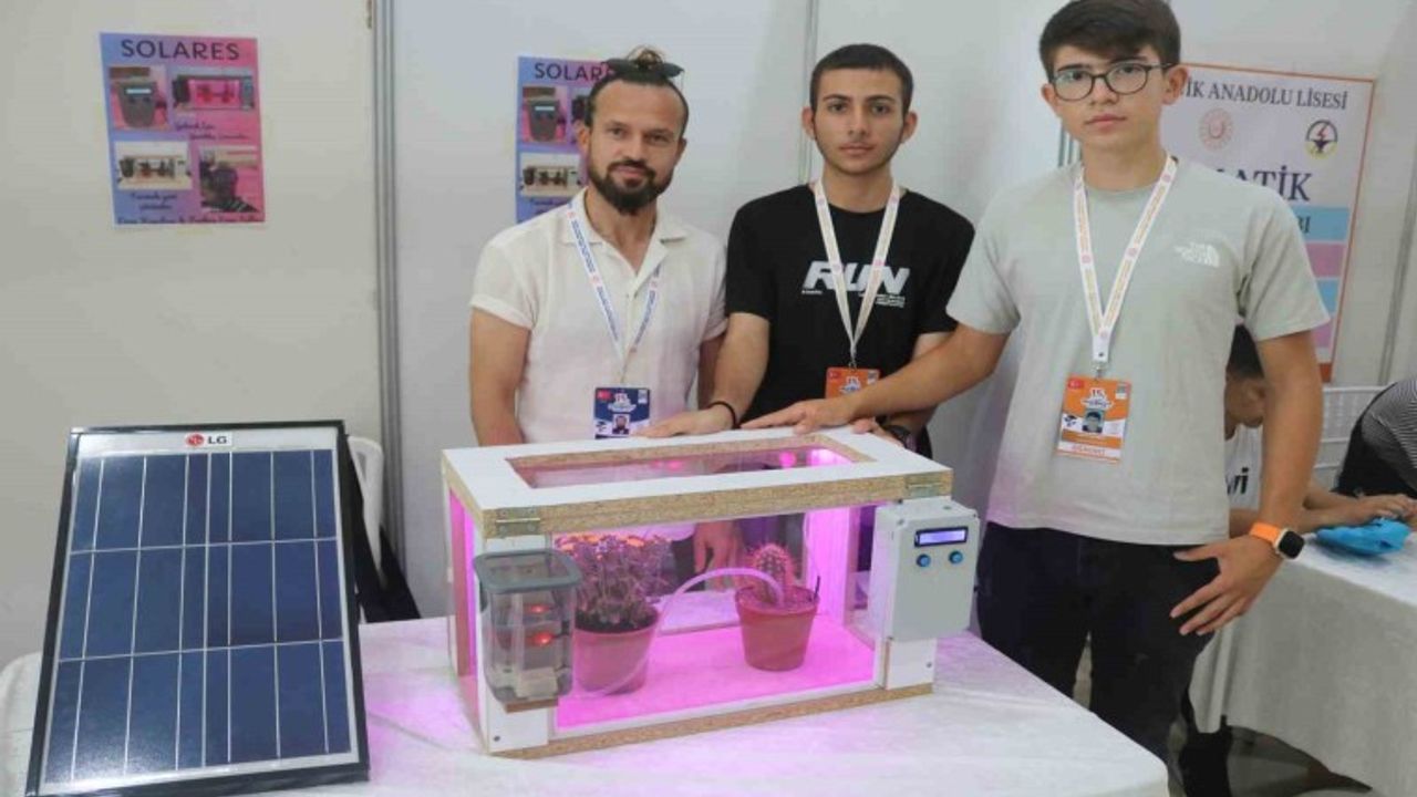 Projeyi anlatan lise öğrencisi Eren Kayabaşı, “Projenin ismi ‘Solares’. İsmi solar paneli ve sera birleşiminden geliyor. Yenilenebilir enerji kaynaklarını kullanıyoruz ve israfı daha aza indirmek için bu projeyi geliştirdik. Çiftçilerimiz evinden tarlalarına gitmeleri için bir enerji sarf etmeleri gerekiyor. Bu enerjiyi en aza indirmek için uzaktan kontrol yaptık. Burada oluşturduğumuz mini serada değerleri uzaktan izleyebiliyoruz. Seramızda botanik bitkilerinden olan kaktüs ve bir adet çiçek kullandık. Kaktüs normal bir çiçeğe göre daha az su ister. Kaktüs ve çiçeğe ayrı bir sulama sistemi yaptık. Kaktüsü ayrı ölçebiliyoruz ve iki ayrı su pompamız var, bu su pompalarından da sulama işlemi sağlayabiliyor. Su haznemizin içerisinde bir adet su sensörümüz var. Bu sensör sayesinde su seviyesi belirli bir miktarın altına düştüğü an bize alarm vermesini sağladık. Alarmın yanı sıra telefonumuza da bildirim geliyor. Bu şekilde de su tankımıza su eklemesi yapabiliyoruz. Güneş ışınlarının az olduğu ortamlarda bitkilerin fotosentezi sağlayabilmesi için biz seramızda ultraviyole ışık kullandık. Ultraviyole ışıklar güneş kadar olmasa da fotosenteze destek sağlayabiliyor. Telefonumuzdaki uygulamada çiçeklerin değerlerini ve nemlerini ayrı ayrı bize gösterebiliyor” şeklinde konuştu.