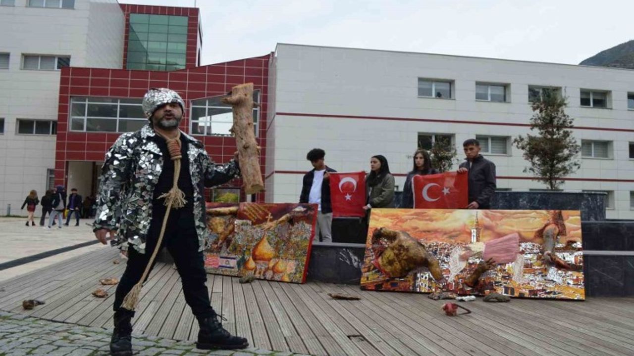 Artvin Çoruh Üniversitesi şehir yerleşkesinde düzenlenen resim sergisine öğrenciler yoğun ilgi gösterdi. Dr. Kemal Sağlam, eline aldığı odun parçasıyla Filistin’de yaşanan vahşeti anlatarak insanlığın bu katliama bir ’odun’ gibi hiç ses çıkarmadığını, görmezden, duymazdan geldiğini söyledi.