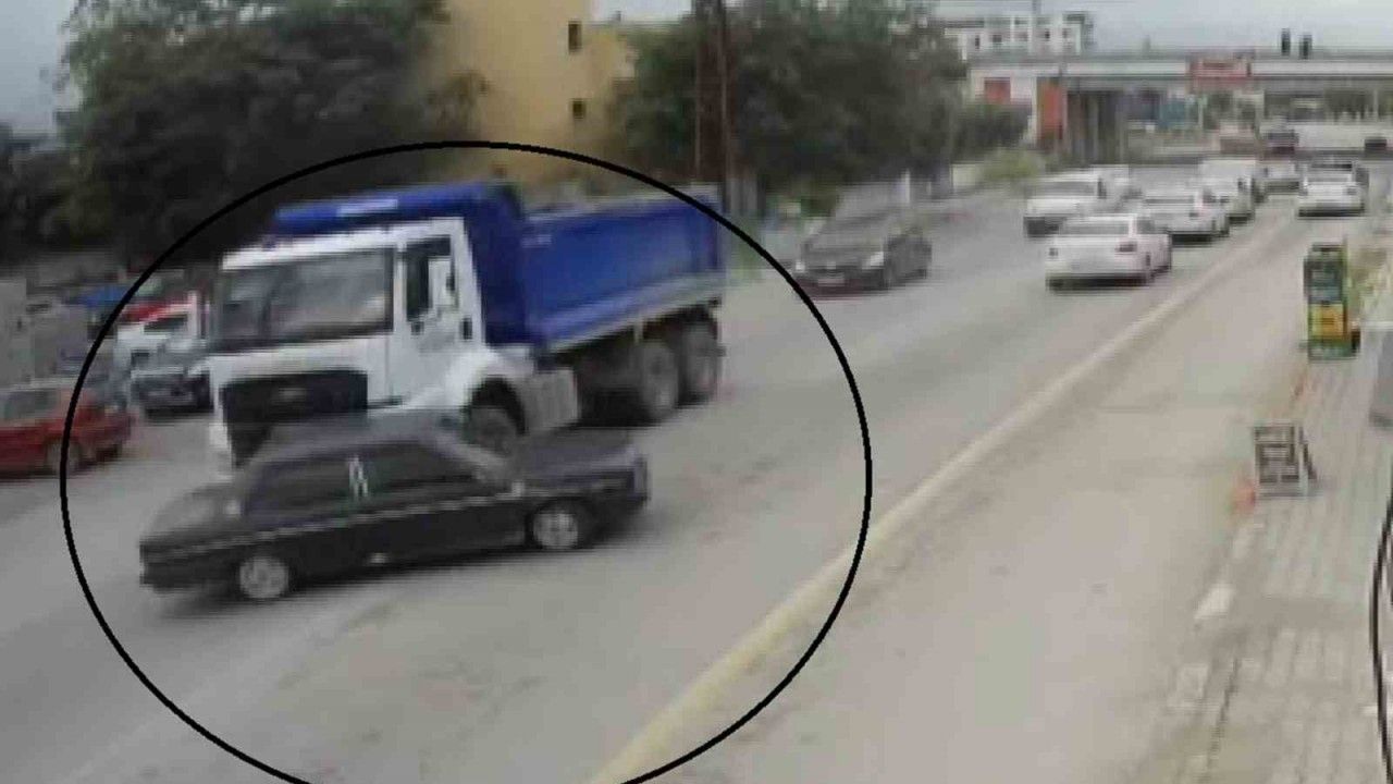 Kaza, Dörtyol ilçesi Musa Kazım Arıkan Bulvarı üzerinde yaşandı. Aynı istikamette ilerleyen hafriyat kamyonu, kör noktasına gelen Tofaş Fiat marka otomobili önüne alarak sürüklemeye başladı. Yaralananın olmadığı kazada oyuncak araba gibi kamyonun önünde sürüklenen araç, park halindeki motosiklete çarparak durabildi. Kaza anıysa çevrede bulunan iş yerinin güvenlik kamerasına yansıdı. Görüntülerde; otomobilin bir anda kamyonun önünde kalarak sürüklendiği görüldü.