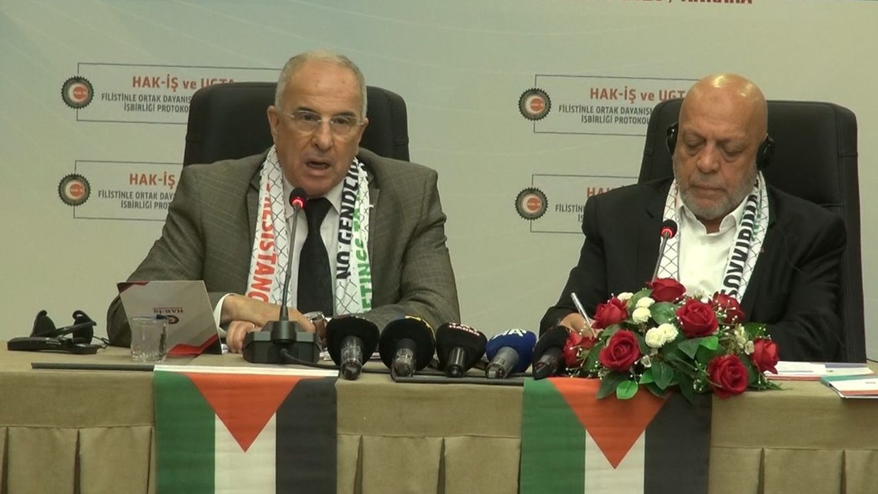 "Bugün UGTA başkanıyla imzalayacağımız Filistin deklarasyonunda bunun daha geniş bir şekilde ifadesini bulacaksınız. Biz konfederasyonumuz HAK-İŞ olarak sesimiz çıktığı sürece nefesimiz yettiği müddetçe bu katliamlara karşı bu gerçekten insanlığın gözü önünde yapılan soykırıma karşı sonuna kadar devam ettireceğiz. Mücadelemizi engellemek isteyenlere karşı daha da güçlü ses vermeye devam edeceğiz. UGTA'yla birlikte ülkemize gelip ikili işbirliği anlaşmalarıyla Filistin Deklarasyonu'nu imzalayan ülke sendikalarına da ayrıca teşekkür ediyorum. Güney Afrika'dan Balkanlar'a Arnavutluk'a kadar pek çok ülkedeki sendikacı kardeşlerimizle ortak deklarasyonları yayınlayarak daha sonra da bunu inşallah bir bütün olarak ülkemizde daha geniş bir ortak çalışmayı da HAK-İŞ olarak gerçekleştirme umuduyla bugün bu toplantımızla Filistin'e desteğimizi bir kez daha ifade etmek imkanımız oldu."