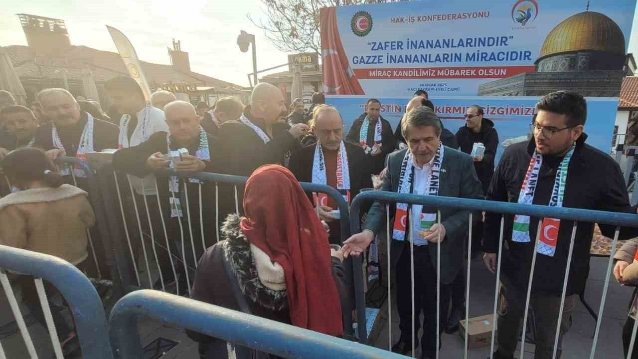 HAK-İŞ tarafından Miraç Kandili dolayısıyla Hacı Bayram Veli Camii’nde ikindi namazı sonrası süt ve lokma dağıtıldı. Programda HAK-İŞ Filistin ve Kudüs Komitesi Başkanı Hüseyin Tanrıverdi açıklamada bulundu. İsrail ile Filistin arasında gerçekleşen ateşkes mutabakatını önemli bir adım olarak gördüklerini ifade eden Tanrıverdi, “Bütün dünyanın gözleri önünde siyonist İsrail’in yarım asırdan uzun bir süredir acımasızca gerçekleştirdiği soykırım ve katliamlarına maruz kalan Filistin ve Gazze’nin yiğit evlatlarını verdikleri asil mücadele ve elde ettikleri başarı dolayısıyla kutluyoruz. 1948 yılında kan ve işgal üzerine kurulan İsrail, o günden bu yana işgalini sürekli genişletmiştir. 7 Ekim 2023 tarihinden bu yana şiddetini artırarak Filistin’de, özellikle Gazze’de yüzyılın en ağır trajedisi ve insanlık tarihinin en acımasız katliamlarından biri yaşanmıştır. Siyonist İsrail, Gazze’yi bir açık hava hapishanesine dönüştürmüş, ciddi insan hakları ihlalleri yaparak soykırım gerçekleştirmiştir” dedi.