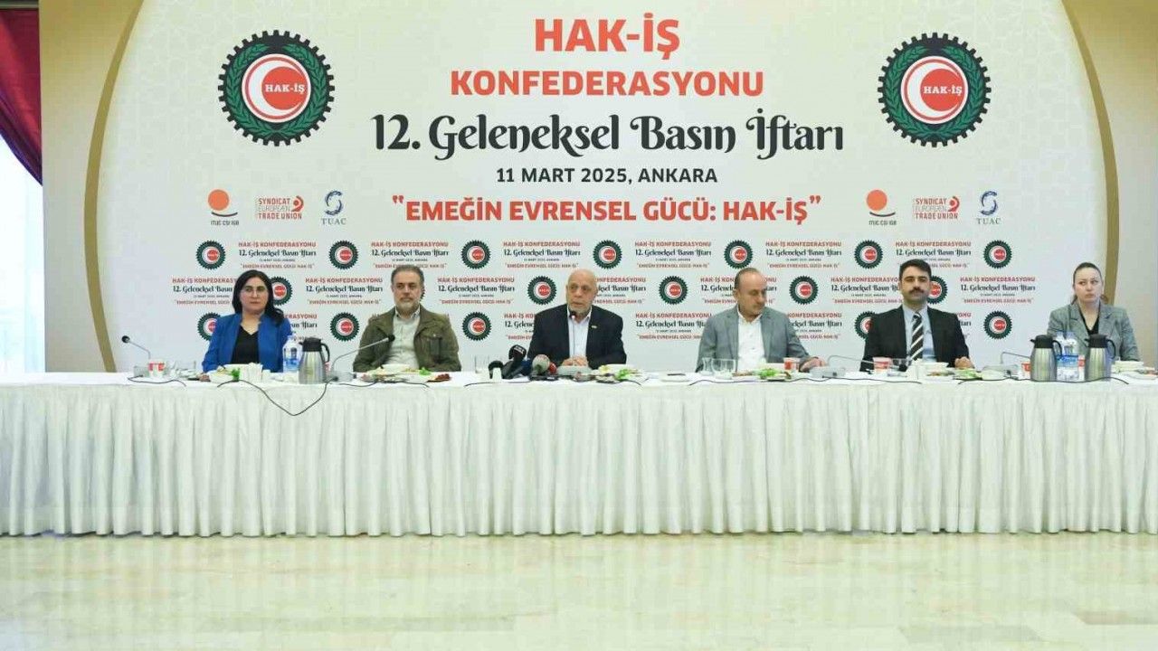 HAK-İŞ Konfederasyonu tarafından geleneksel hale gelen 12’inci Basın İftarı ‘Emeğin Evrensel Gücü HAK-İŞ’ başlığıyla gerçekleştirildi. Program çerçevesinde basın mensuplarına konuşan HAK-İŞ Genel Başkanı Mahmut Arslan, Asgari Ücret Tespit Komisyonu’nun yapısı, vergi sistemi, Kamu İşçisi Çerçeve Protokolü süreci başta olmak üzere birçok konuya ilişkin değerlendirmelerde bulundu.