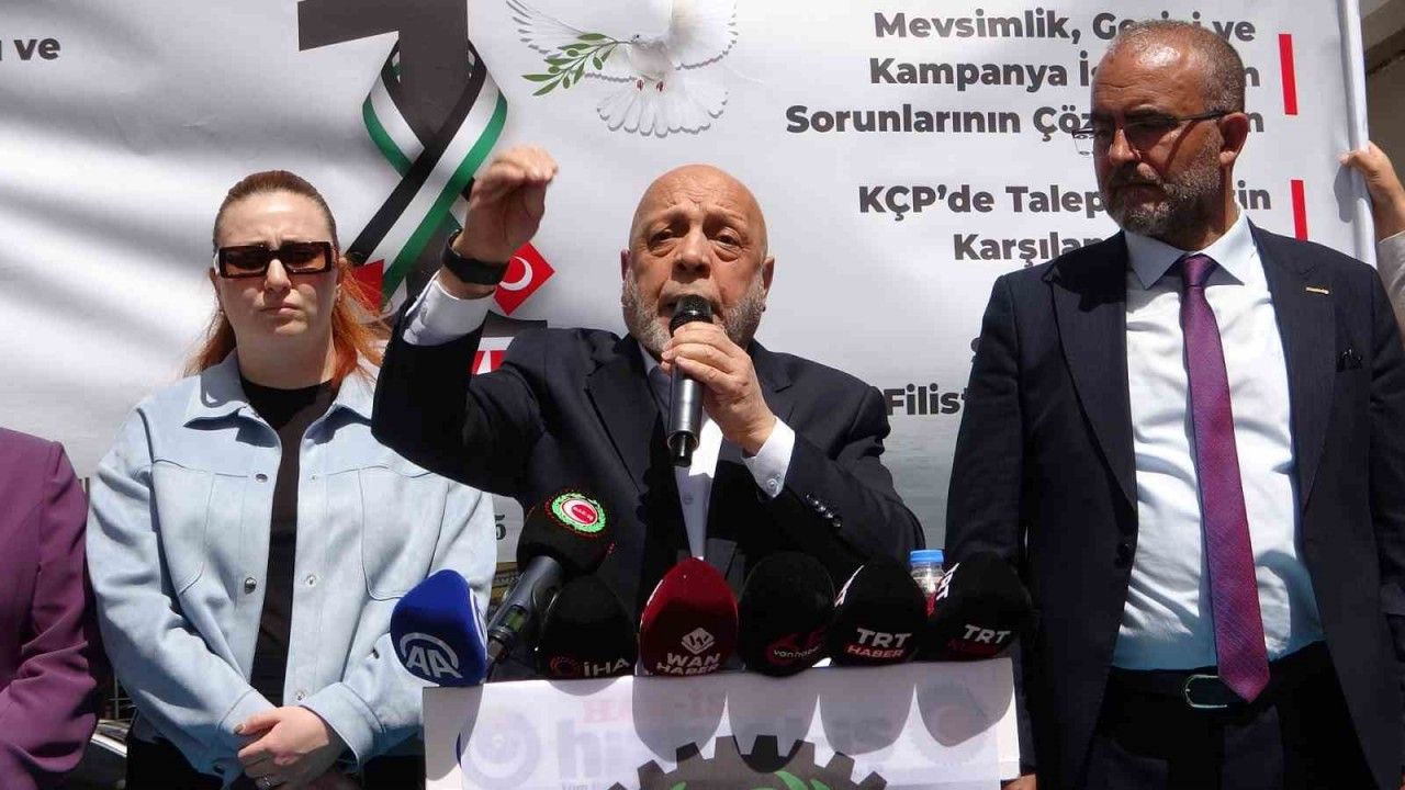 Hak-İş Genel Başkanı Mahmut Arslan, Van’da bazı belediyeler tarafından işten çıkarılan işçilere destek ziyaretinde bulundu. İpekyolu Belediyesi önüne kurdukları çadırda eylemlerini sürdüren işçilerle görüşen Arslan, daha sonra kalabalığa seslendi. Bir siyasi parti, muhalefetin veya iktidarın alternatifi olmadıklarını belirten Aslan, amaçlarının mensuplarının haklarını, hukuklarını korumak, mücadelelerinde yanlarında olmak, ekmeklerini ve aşlarını büyütmek olduğunu ifade etti. Şimdiye kadar olduğu gibi bundan sonra da üyelerinin hakkını savunacaklarını belirten Aslan, "Bunlar eğer haklarımıza saygı göstermiş olsalardı, işçilerin aşıyla, ekmeğiyle oynamasalardı, Van halkının oylarıyla seçilmiş bu belediye başkanları bizimle uğraşmasaydı bizim onlarla ne sorunumuz olabilir? Ekmeğimizi elimizden almaya kalkarlarsa biz hep burada olacağız. 31 Mart 2024 seçiminden sonra propagandaları şuydu. ’Bütçemizde para, imkanlar yok. Bu işçiler seçim öncesi işe alınmışlar.’ Buradan sesleniyorum. İşten çıkardığınız kardeşlerimiz hakkında bir soruşturma, bir disiplin çalışması, işe gelmedi, verilen işi yapmadı diye işlem var mı? Yok. Dediniz ki ’İşçi fazla, paramız yok.’ Büyükşehir Belediyesi ile VASKİ’ye bine yakın işçi aldınız. Hani işçi fazlaydı? Hani paranız yoktu? Bu işçilerin ekmeğini elinden alacaksınız, sonra da işçi alacaksınız. Bu iki yüzlülük, sahtekarlık, yalancılık, samimiyetsizliktir. İşçiler işlerine dönene kadar mücadelemizi sürdüreceğiz. İşten çıkarılanların tek kusuru var. Kandil’in ve onun yandaşlarına destek vermemeleri, onlarla yan yana olmamalarıdır. Bu arkadaşlarımızın başka bir kusuru yok. Herkes aklını başına almalıdır" dedi.