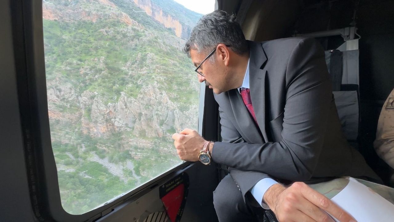 Hakkari Valisi Ali Çelik, girdiği derede kaybolan 16 yaşındaki İbrahim Necir Kom’u arama çalışmalarını havadan inceledi.