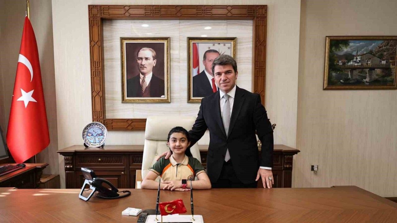 Amasya’da katıldığı halk günü toplantısında Vali Önder Bakan’dan 23 Nisan öncesi makam koltuğuna oturmasını isteyen kız öğrencinin isteği yerine geldi. Vali Bakan, makam koltuğuna geçen Afra Gül ile fotoğraf çektirdi.